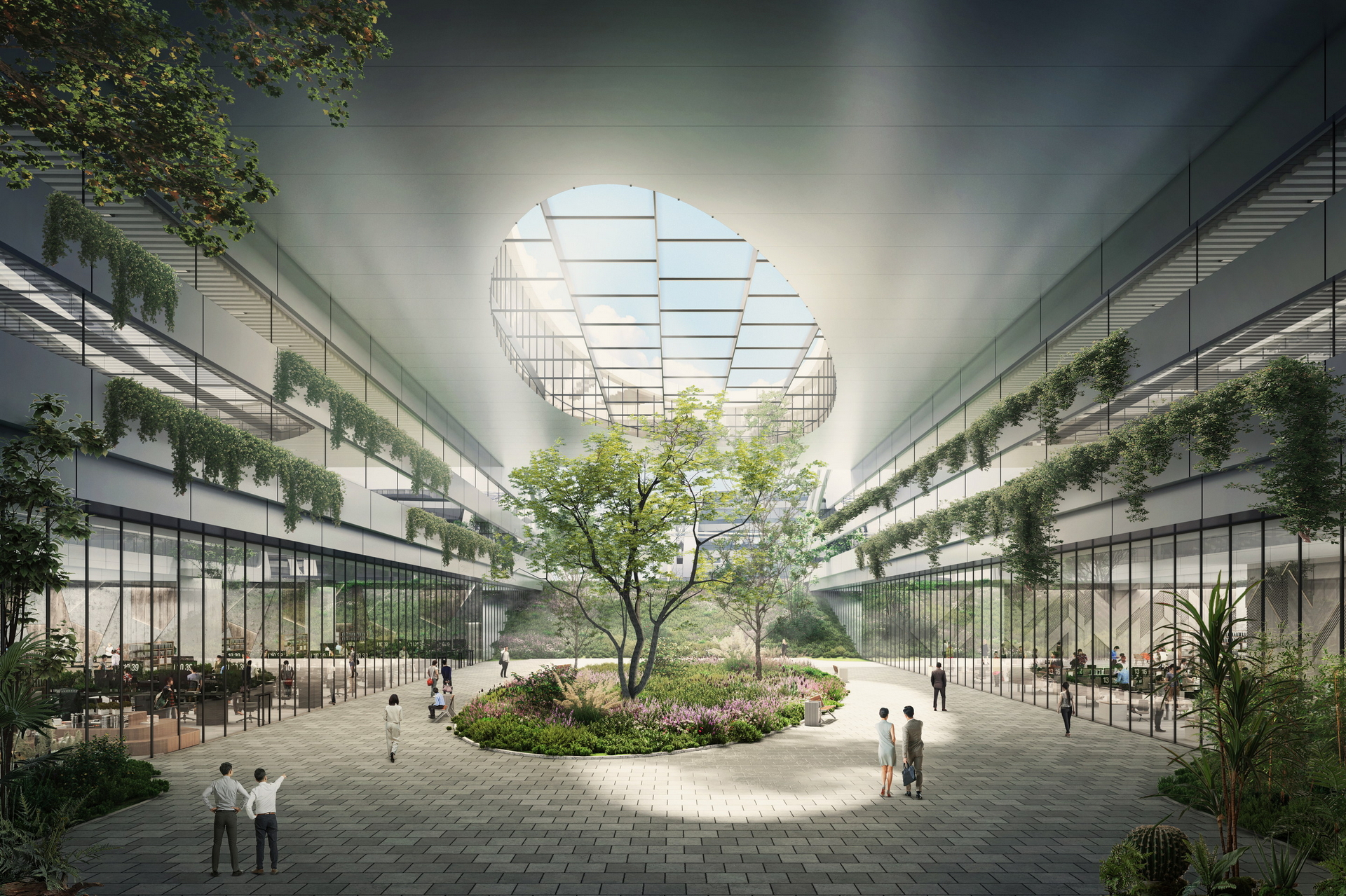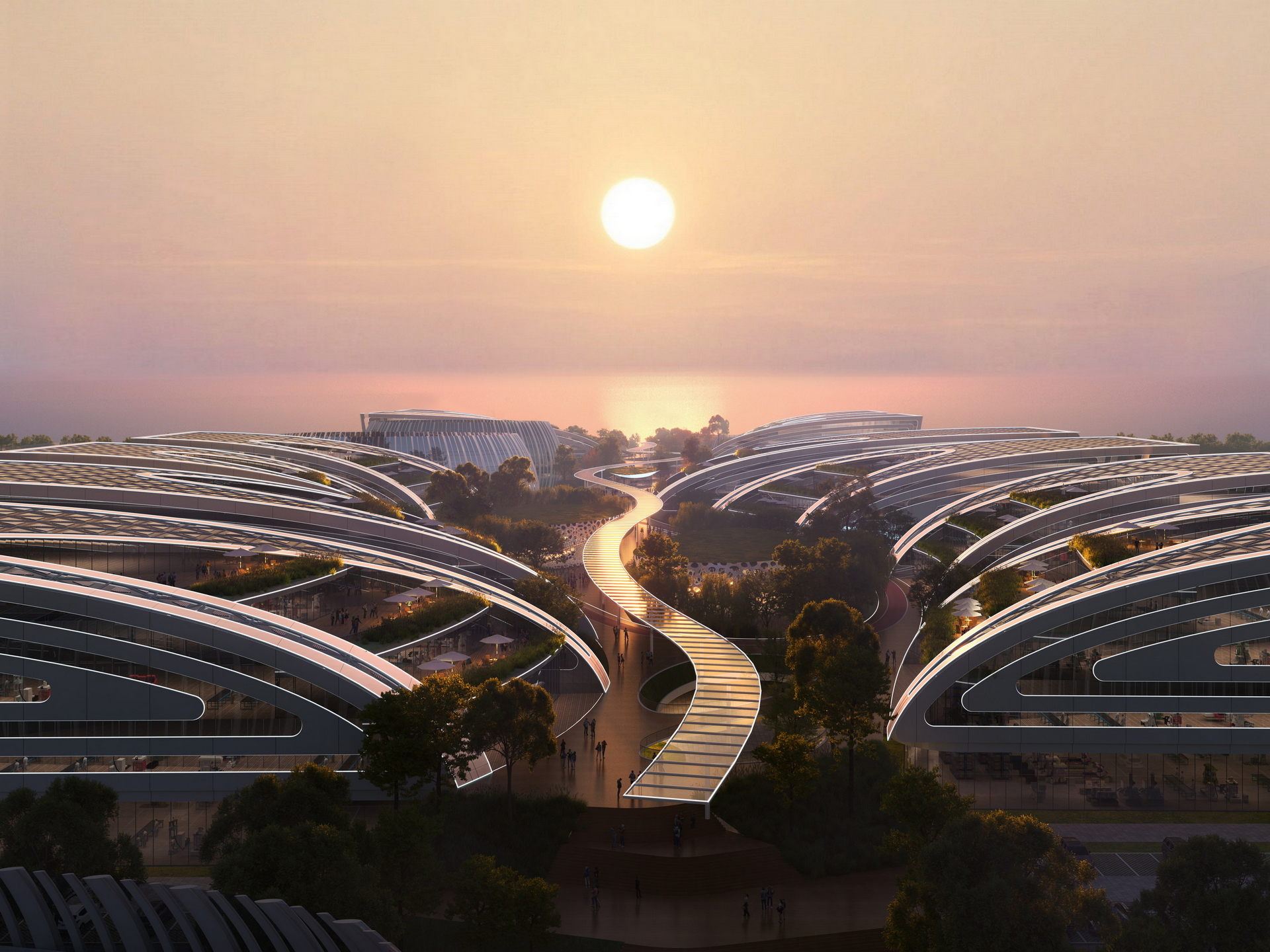 设计以“智慧互联·绿色创新·集约发展”为导向,建筑风格现代简约,立面提取自然元素塑造流动感,景观系统依托南侧城市绿轴,通过东西向轴线与楔形绿地渗透全园,形成内外联动的生态共享轴。人车分流设计结合角部竖向交通与景观步道,实现内外人流高效集散,同时塑造“通山达海”的城市地标形象。